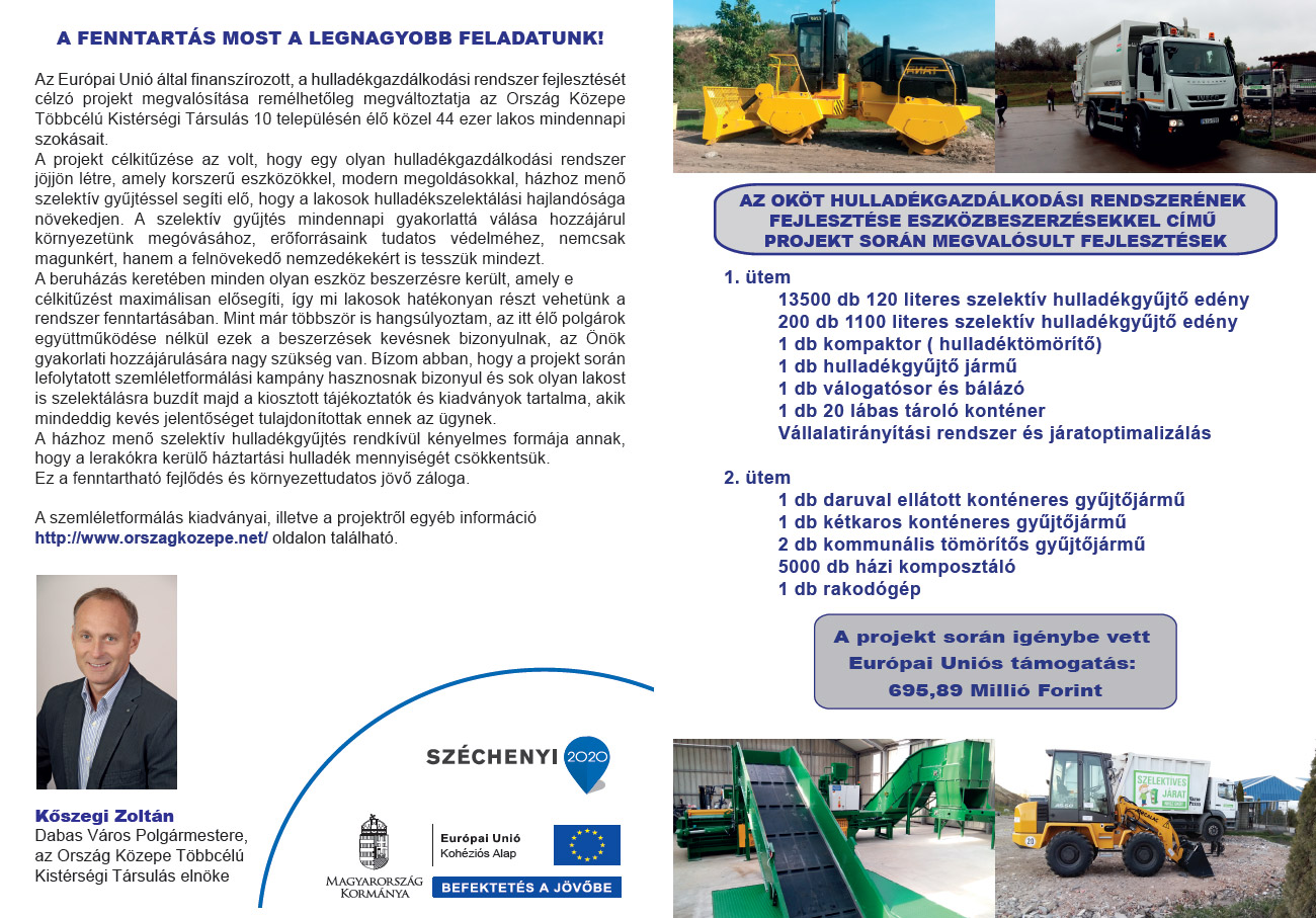 A FENNTARTÁS MOST A LEGNAGYOBB FELADATUNK! címmel az Ország Közepe Többcélú Kistérségi Társulás „Az ÖKOT hulladékgazdálkodási rendszerének fejlesztése eszközbeszerzésekkel” projektjének lakossági ismertető anyagát készítette el szórólap formájában és kezdte meg terjesztését a településeken.